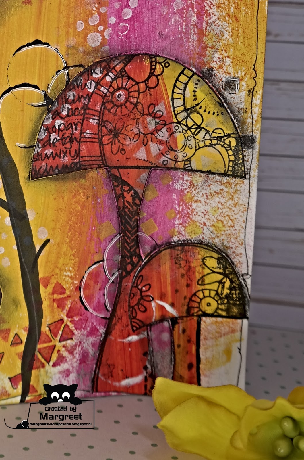 Wat vind ik die weer gaaf (en er vielen er dus wat in mijn winkelmandje). Daarna uitknippen en positioneren op de ondergrond, waarop eerst met stencils (Dutch Doobadoo) en verf details waren aangebracht. Als je het naar je zin vond, kon je de boel op gaan plakken. Met een crayon de vormen omgetekend en met een natte vinger uitgevaagd. Als laatste nog wat accentjes met de witte uni-ball pen aangebracht.